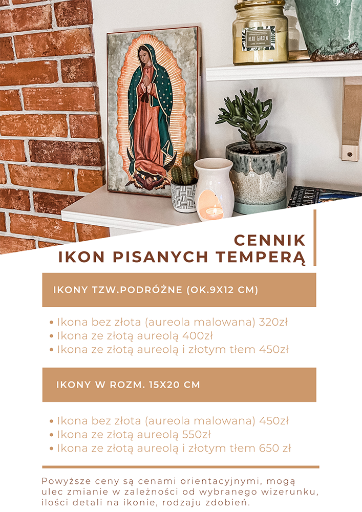 Przedstawione ceny są cenami orientacyjnymi. Na dokładną wycenę wpływ mają: technika malarska, rozmiar deski, ilość przedstawionych postaci, stopień skomplikowania wizerunku czy ilość zastosowanego złota w ikonie.